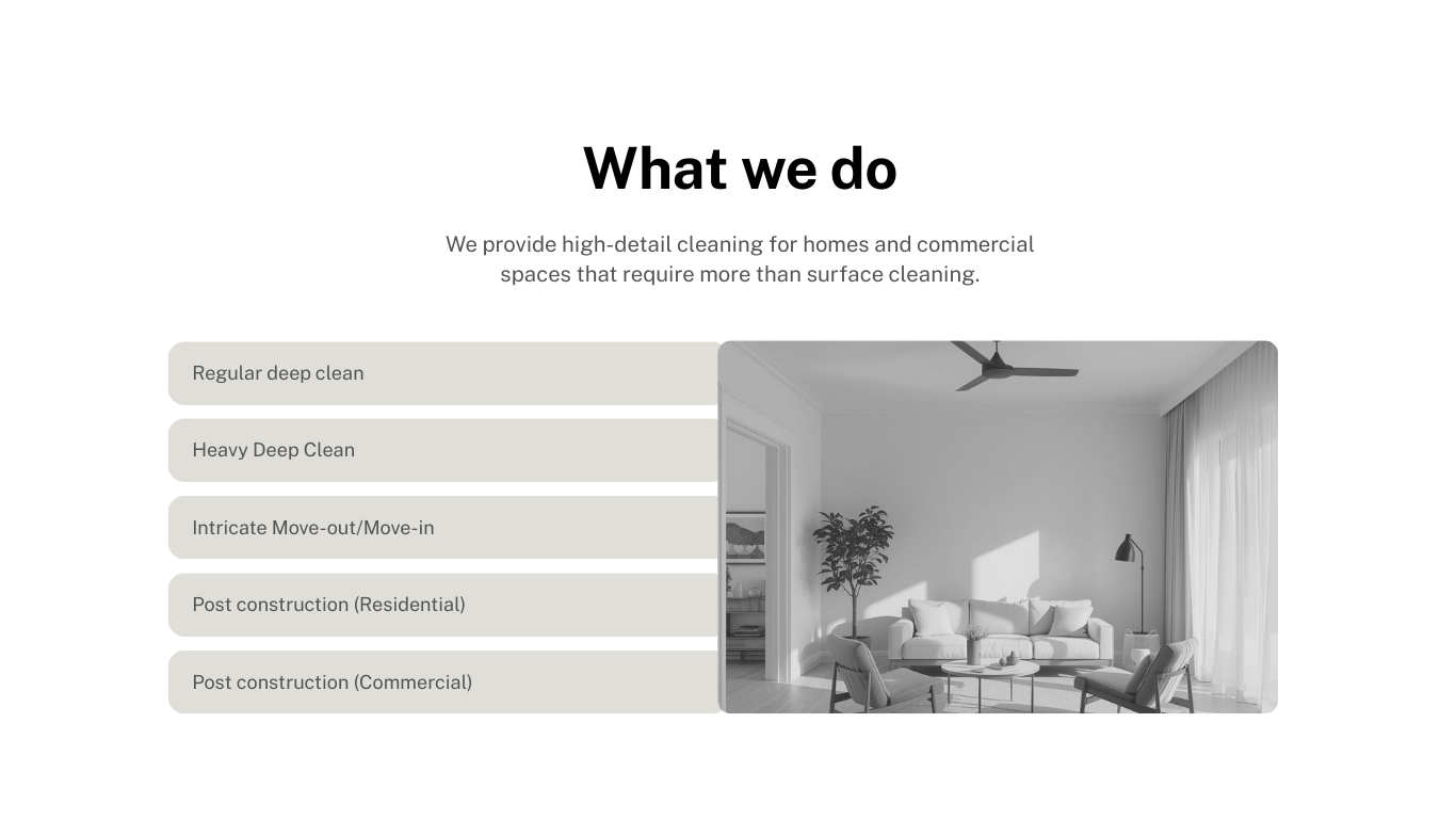 We specialize in intricate move-out cleans and post-construction cleaning for residential and commercial spaces. Meticulous service, professional results, and a finish you can feel.